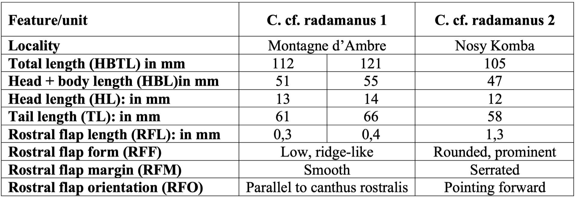 Contrary to typical C. radamanus and C. cf. radamanus 1 from Montagne d'Ambre, the rostral flap was not small, but prominent, rounded, serrated and situated in front of the snout tip.