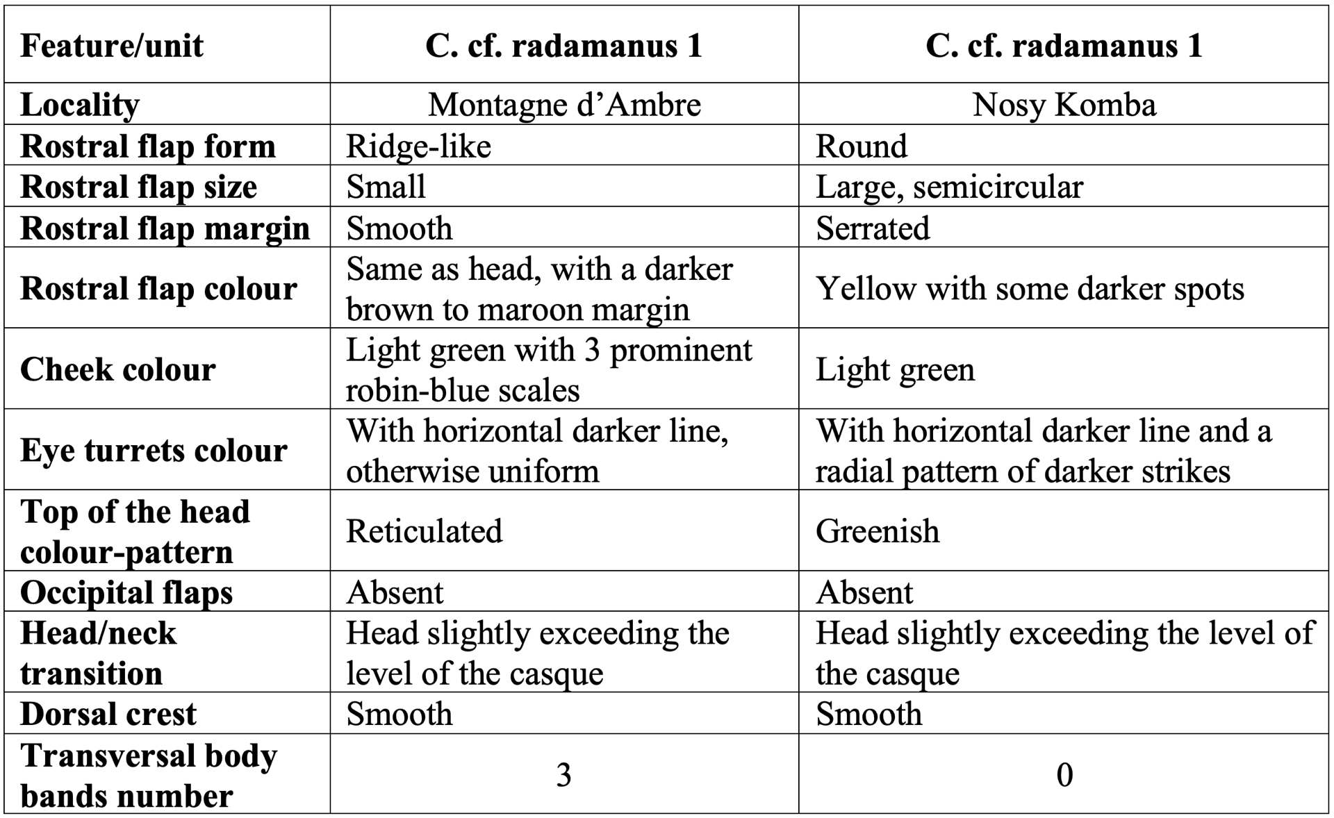 Based on the detailed comparison, it is probable that, although provisionally referred to C. radamanus due to the above‑mentioned logic, the Montagne d'Ambre population appears morphologically much closer to C. radamanus s.str.than the population from Nosy Komba. It is very likely that at least the latter, if not both, represent separate taxa. The Nosy Komba specimen exhibits a feature not typical for C. radamanus: a serrated rostral flap. In Montagne d'Ambre, the syntopic species Calumma linotum possesses a prominent serrated rostral flap, so the regular non‑serrated flap remains sufficient to differentiate C. radamanus and stays typical without the necessity of change (Rand, 1961; Prötzel et al., 2020; Benarson & Nečas, 2025). By contrast, the Nosy Komba population may have evolved a serrated flap as an optical differentiation against the smooth‑edged rostral flap of Calumma boettgeri. This could be a feasible explanation for the observed differences. However, as the differences in the form of the rostral flap, in fine morphology and size are otherwise significant, it remains possible that the two populations are not conspecific and may even both—or at least the Nosy Komba population—be not conspecific with C. radamanus.