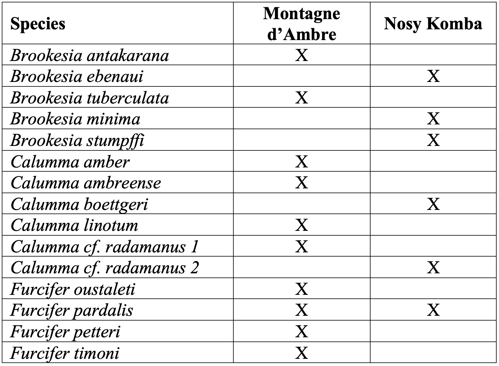 - C. amber and C. ambreense are both microendemics of the massif, reinforcing Montagne d'Ambre's role as a diversification hotspot.